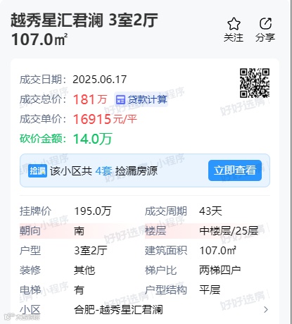 瑶海老城区越秀星汇君澜一套107㎡房源,总价181万成交,成交单价16915元/㎡。