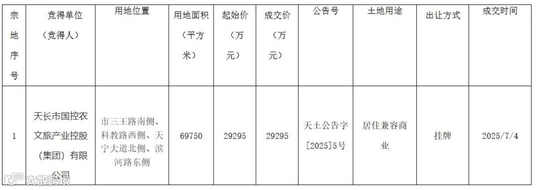 年7月4日,天长市自然资源和规划局在市公共资源交易中心公开出让1宗商住用地,成交1宗。根据原国土资源部《招标拍卖挂牌出让国有建设用地使用权规定》的要求,现将成交结果公告如下: