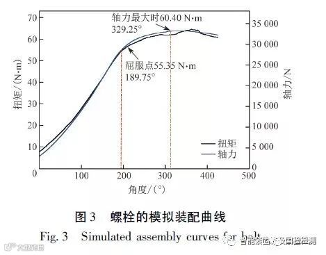 在某些情况下,需对高强度螺栓施加接近或达到其屈服强度的装配预紧力,装配工艺不合理也可能导致过载断裂。螺栓的预紧力与装配扭矩之间的关系如式( 1) 所示。F = T /( K·d) ( 1)式中: F 为预紧力,T 为装配扭矩,K 为扭矩系数,d 为螺纹公称直径。由于扭矩系数K 具有离散性且受环境影响而产生波动,装配时难以将预紧力精确控制在其屈服点附近,若K 值偏小,就可能造成预紧力超过螺栓的最大承载力而断裂。某柴油发动机缸盖螺栓在采用扭矩法控制装配时发生断裂,分析发现,该批螺栓力学性能符合要求,但由于扭矩系数离散性较大,部分螺栓在装配时发生过拧断裂。通过分析模拟装配曲线发现,在拧紧螺栓到屈服点至断裂的过程中,扭矩波动较小,难以通过设置扭矩阀值来控制装配,如图3 所示。因此,当所需的预紧力接近或达到螺栓屈服点时,采用扭矩控制法装配是不合理的,宜采用扭矩加角度控制的装配方法。