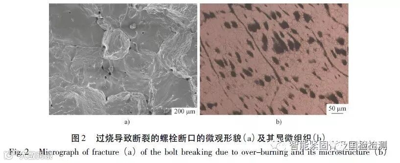 动车组M30 以上大规格螺栓普遍采用人工控制的感应加热和热锻工艺进行生产,劳动强度大且易过热甚至过烧,使螺栓发生过载断裂。图2 为装配时头部断裂的某动车组用螺栓的断口形貌和显微组织。图2 表明: 断口有沿晶断裂特征,晶粒圆钝,并有大量显微孔洞,为典型的过烧特征; 经饱和苦味酸溶液腐蚀后可见双重晶界,即除了正常的原奥氏体晶界,还出现过烧形成的黑色粗大晶界。因此采用红外测温和自动控制是热锻螺栓质量控制的发展趋势。
