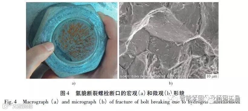 是否具有延迟断裂特征是判断紧固件氢脆断裂的重要依据。氢脆断口的宏观特征为近表面有明显的点状裂纹,如图4( a) 所示,微观上呈“冰糖状”沿晶断裂形貌,且晶粒表面有鸡爪状撕裂棱和晶间二次裂纹,这也是区分氢脆与回火脆性断口的重要特征,见图4( b) 。如果符合延迟断裂和断口特征两个判据,基本上可以断定是氢脆断裂,氢含量的检测可作为辅助手段。值得指出的是,分析氢脆失效案例时不能陷入误区,即认为氢脆一定是氢含量过高引起的。实质上氢脆是多种因素共同作用的结果,很多具有明显氢脆断裂特征的高强度紧固件,其氢含量并不高,有些甚至在氢含量低于1 × 10 - 6 的情况下也发生延迟断裂。一方面,材料的强度越高,对氢越敏感,较低氢含量也可诱发氢脆; 另一方面,目前普遍采用的热熔测氢法是测定1 g左右材料的平均氢含量,而实际上氢在材料中的分布是不均匀的,氢会在应力集中、位错和空位等微观缺陷密度较高的部位富集,这意味着在裂纹孕育和萌生的过程中,裂纹尖端局部氢含量比实际检测的要高很多。另外,氢在常温下也能扩散,会在张应力大的区域富集,导致材料( 尤其是晶粒间) 的累计损伤,进而引发延迟断裂。