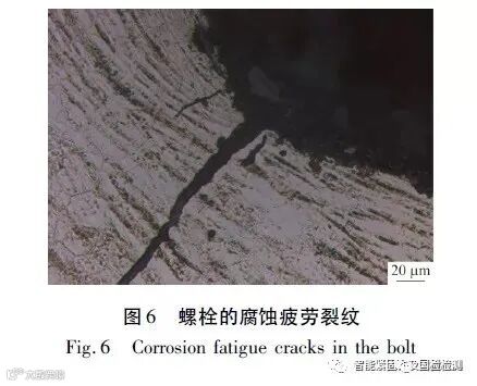 在腐蚀介质作用下,螺栓的疲劳门槛值会显著降低,承受动载荷的螺栓发生疲劳的概率也会显著增大。腐蚀疲劳和应力腐蚀的裂纹通常起源于腐蚀坑,沿晶开裂较为常见。腐蚀疲劳裂纹通常是穿晶扩展,而应力腐蚀的裂纹通常是沿晶扩展,也有部分是穿晶扩展,如奥氏体不锈钢的应力腐蚀有时表现为树枝状的穿晶扩展。应力腐蚀或腐蚀疲劳的断口通常有泥状腐蚀产物,通过能谱分析可检测其中的腐蚀性介质,这是区分两者与其他断裂形式的有效手段。图6 为固定轨道车辆受电弓的螺栓螺纹底部的腐蚀疲劳裂纹。紧固件表面缺陷( 如折叠和微裂纹等) 会导致腐蚀介质渗入缺陷内部,促进应力腐蚀或腐蚀疲劳裂纹的产生。
