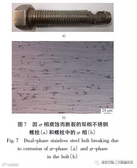 紧固件的腐蚀通常会影响外观质量,并造成拆卸困难,也偶有因腐蚀引发断裂事故的案例。图7 为某电站循环水泵的S32750 双相不锈钢螺栓,在服役约2 年后发生严重的腐蚀、断裂。检测分析发现,该批螺栓奥氏体和铁素体两相界面有大量σ 相,见图7( b) ,这些有害相在螺栓服役环境中首先被腐蚀,造成螺栓剥落、断裂。