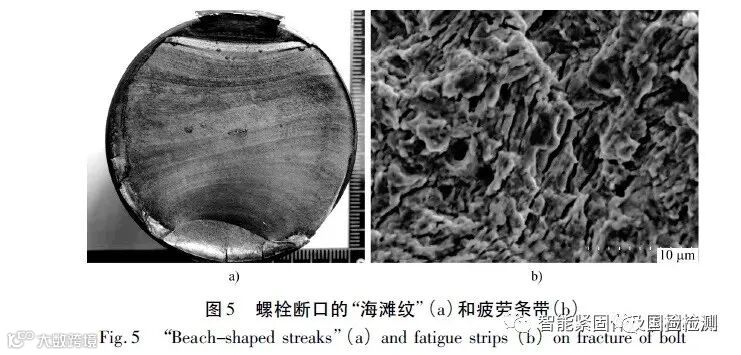 服役过程中发生疲劳断裂的螺栓通常有一定时间的裂纹扩展期,在此期间,由于环境的变化,不同阶段扩展的裂纹会形成有衬度的条纹,在宏观上表现为典型的“海滩纹”或“贝壳纹”,如图5( a) 所示。当环境条件变化不大或短时间内发生疲劳断裂时,如在密闭的发动机内或实验室进行台架试验时发生疲劳断裂的螺栓,其“海滩纹”可能不明显,通过扫描电镜观察断口的微观形貌,断口的裂纹扩展区可见一系列几百纳米到微米级间隔的平行条带,称为“疲劳条带”,如图5( b) 所示。这是疲劳断口典型的微观特征,从疲劳条带的间隔大小和分布还可以推断疲劳载荷幅的大小和经历的载荷周次,对疲劳断裂进行定量分析。