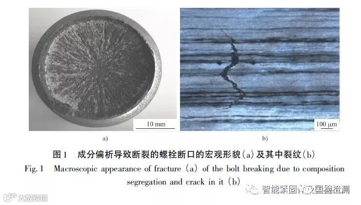 图1 为装配过程中发生断裂失效的某10. 9级风电塔筒螺栓,断口附近无明显塑性变形,断裂特征与韧性过载的差异较大,裂纹源于螺栓心部,呈放射状向外侧扩展。检测分析发现,螺栓材料有明显的带状偏析、显微疏松和裂纹,这些缺陷导致螺栓承载能力不足而断裂,采用42CrMo、B7、40CrNiMo 钢制造的M36 以上大规格螺栓较易发生。该类缺陷主要是钢材在凝固过程中形成的成分偏析及疏松缺陷引起的,偏析严重不但会引起异常断裂,还会增大螺栓的淬火开裂倾向,影响低温冲击性能和断面收缩率。这类成分偏析属于微观偏析,与GB /T 6478—2015《冷镦和冷挤压用钢》中的低倍偏析不同,由于缺乏相应的检测方法和判定依据,钢厂和紧固件制造企业鲜有将此类缺陷纳入验收检查项目。但随着大规格风电螺栓用量的增大,此类缺陷造成的失效案例也越来越多。近年出版的GB /T 34474. 1—2017《钢中带状组织的评定第1 部分: 标准评级图法》和GB /T34474. 2—2018《钢中带状组织的评定第2 部分:定量法》对此类缺陷有更明确的定义和检测方法,有助于加强原材料的质量控制。