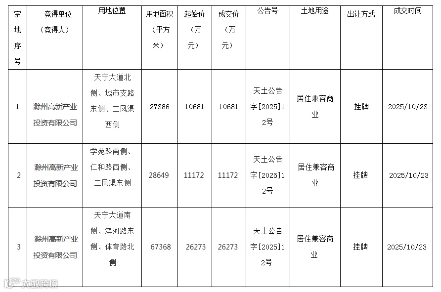 2025年10月23日,天长市自然资源和规划局公开出让的3宗商住用地全部成交,由滁州高新产业投资有限公司竞得。地块位于天宁大道、学苑路等城市核心区域,总面积超10万平方米,将用于居住兼容商业开发,容积率均控制在1.6以内。此次成交标志着天长市在落实国土空间规划、优化城市布局方面迈出坚实一步,为区域高质量发展注入新动能。