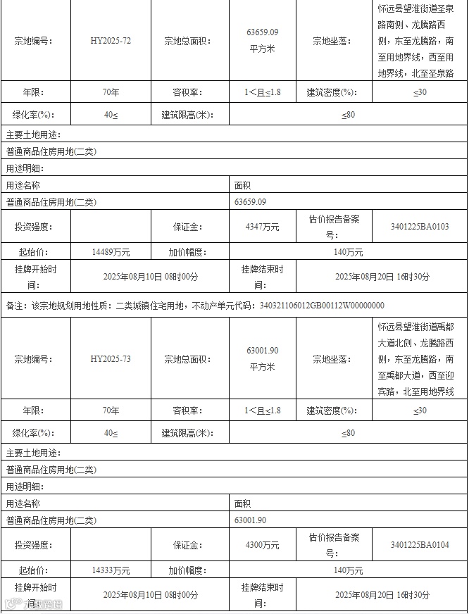 HY2025-72号地块:2025年08月10日08时00分 至 2025年08月20日16时30分;