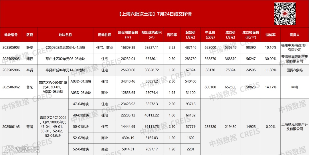 7月24日,上海六批次土拍首日燃爆盛夏!5宗地块成交额达185.3亿元,4宗溢价成交印证市场信心。焦点之战落在闵行莘庄——安徽高速地产历经78轮激烈角逐,力克中海、保利、象屿等头部房企,以36.887亿元+4000元/㎡装修标准+2650㎡公共服务设施的承诺强势竞得地块,楼面价达56247元/㎡,溢价率触顶30%!