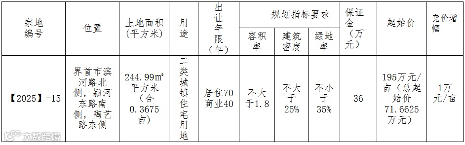 六、本次国有建设用地使用权拍卖会定于2025年6月18日15时在界首市公共资源交易中心举办。