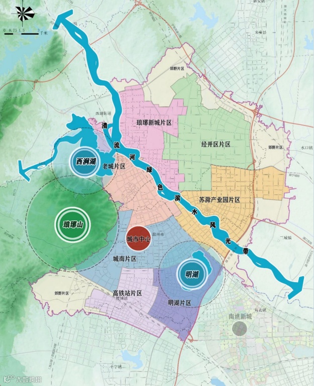 滁州中心城区以“一河两湖一山两城”为脉络,形成“一心七片”功能布局: