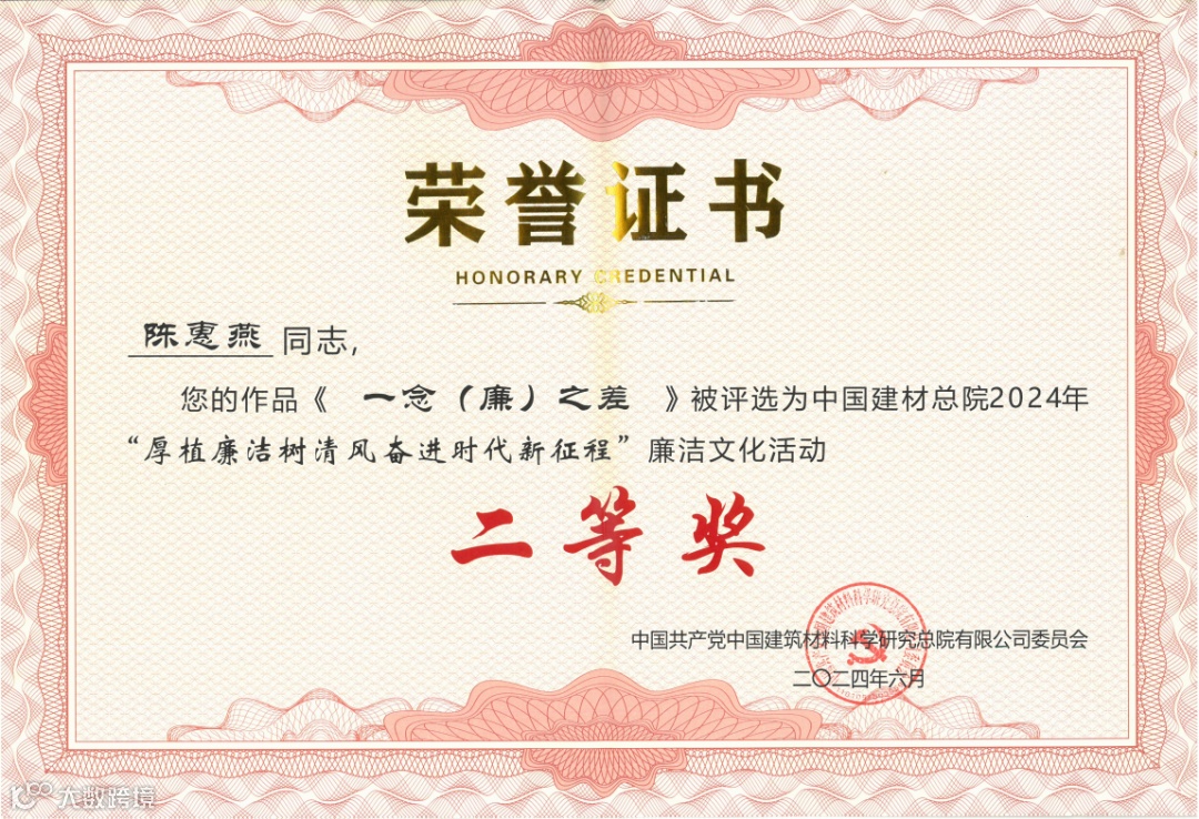 为深入学习贯彻党的二十大和二十届二中全会精神,认真学习领会二十届中央纪委三次全会精神,深化政治生态建设,涵养风清气正氛围,总院党委、纪委组织开展了“厚植廉洁树清风 奋进时代新征程”主题廉洁文化作品征集活动。国检京诚广大员工积极参与创作投稿,经评审最终获二等奖作品1件、优秀作品奖6件。