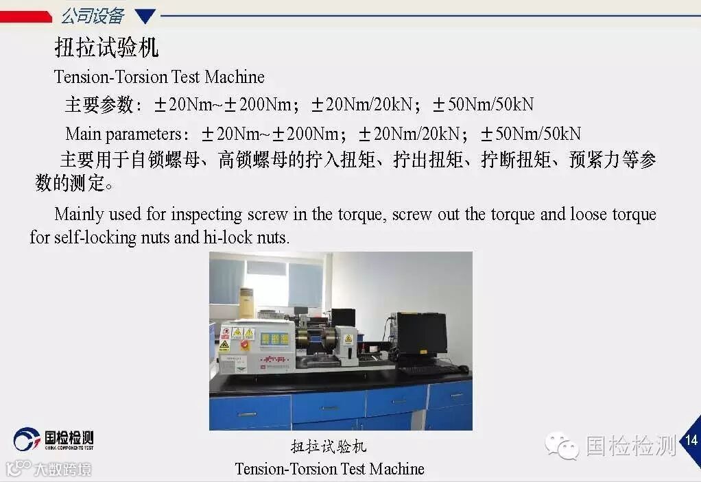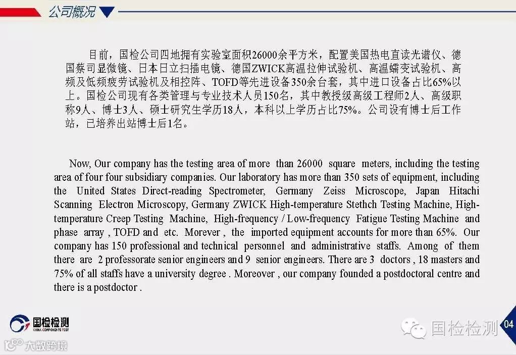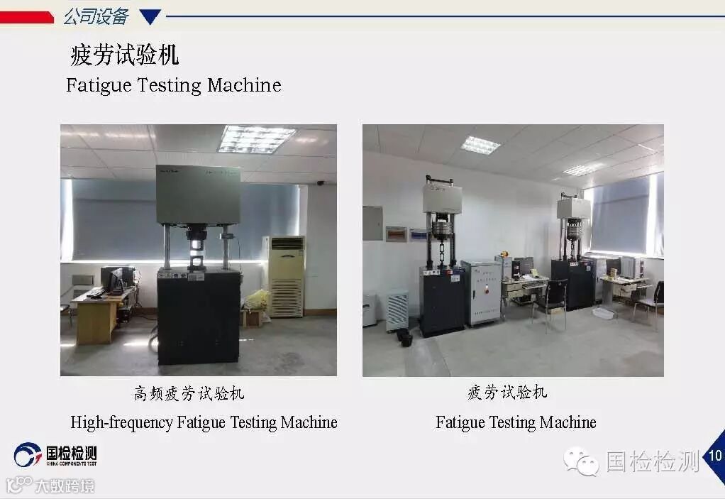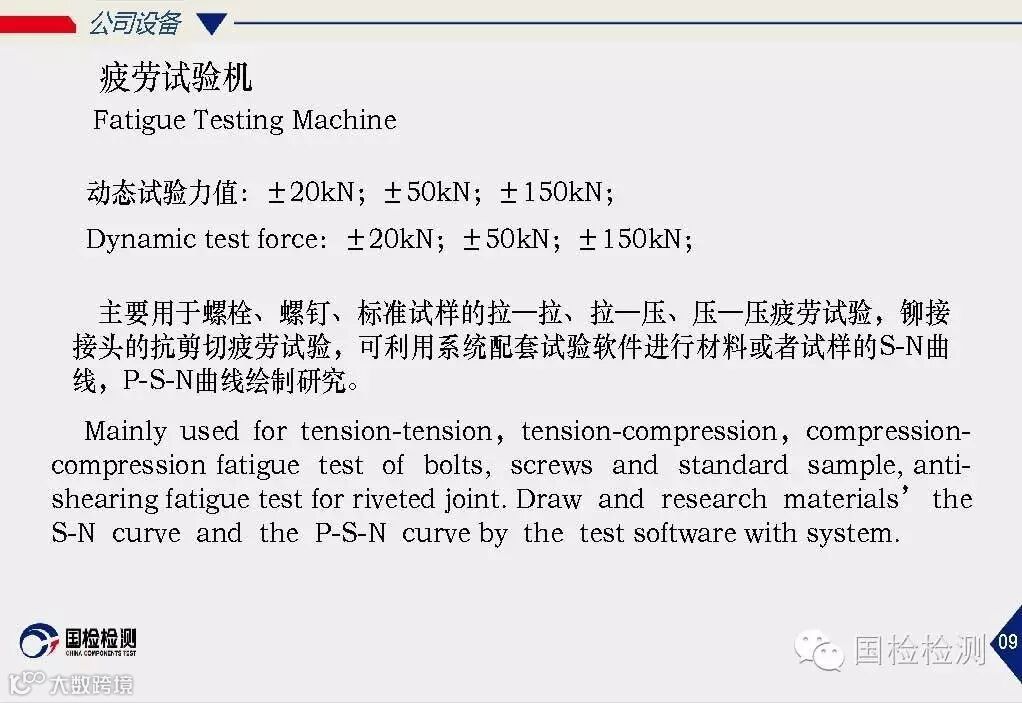 公司通过了CMA、CAL、CNAS、DILAC认可、NADCAP认证;可开展标准件系列产品、金属材料、机械零部件、焊接材料、轴承等检测;压力容器等无损检测;复合材料、橡胶、塑料、油漆等非金属材料检测;长度、力学、化学、热工、电学类校准.
