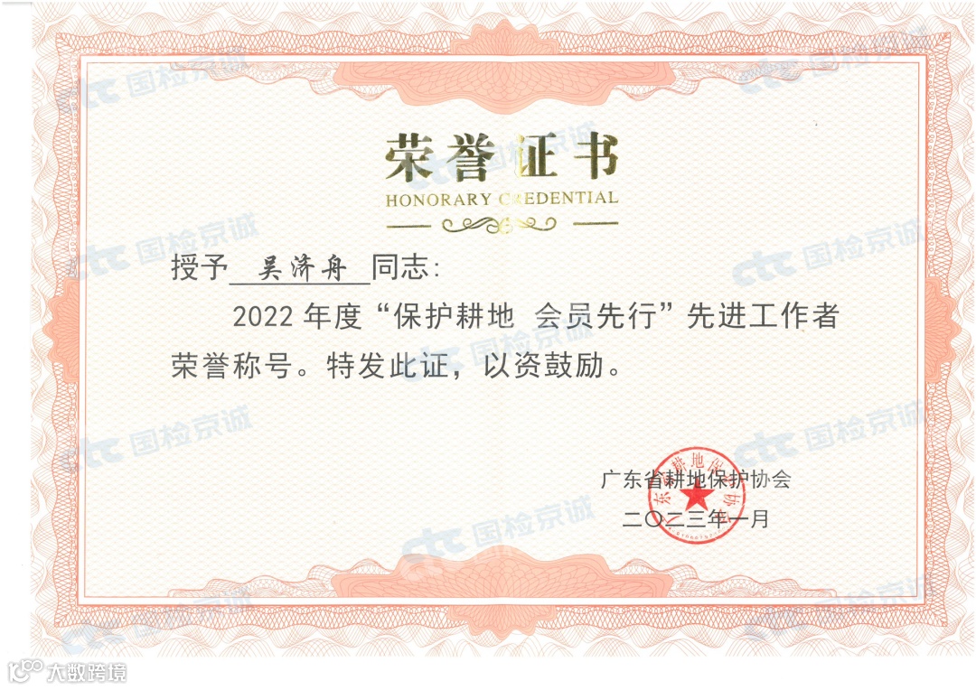 近日,在广东省耕地保护协会关于2022年度“保护耕地 会员先行”先进集体和先进工作者评选中,国检京诚荣获“先进集体”(标兵会员单位)称号,为获奖单位中唯一一家检验检测机构,刘永、吴济舟荣获“先进工作者”称号。