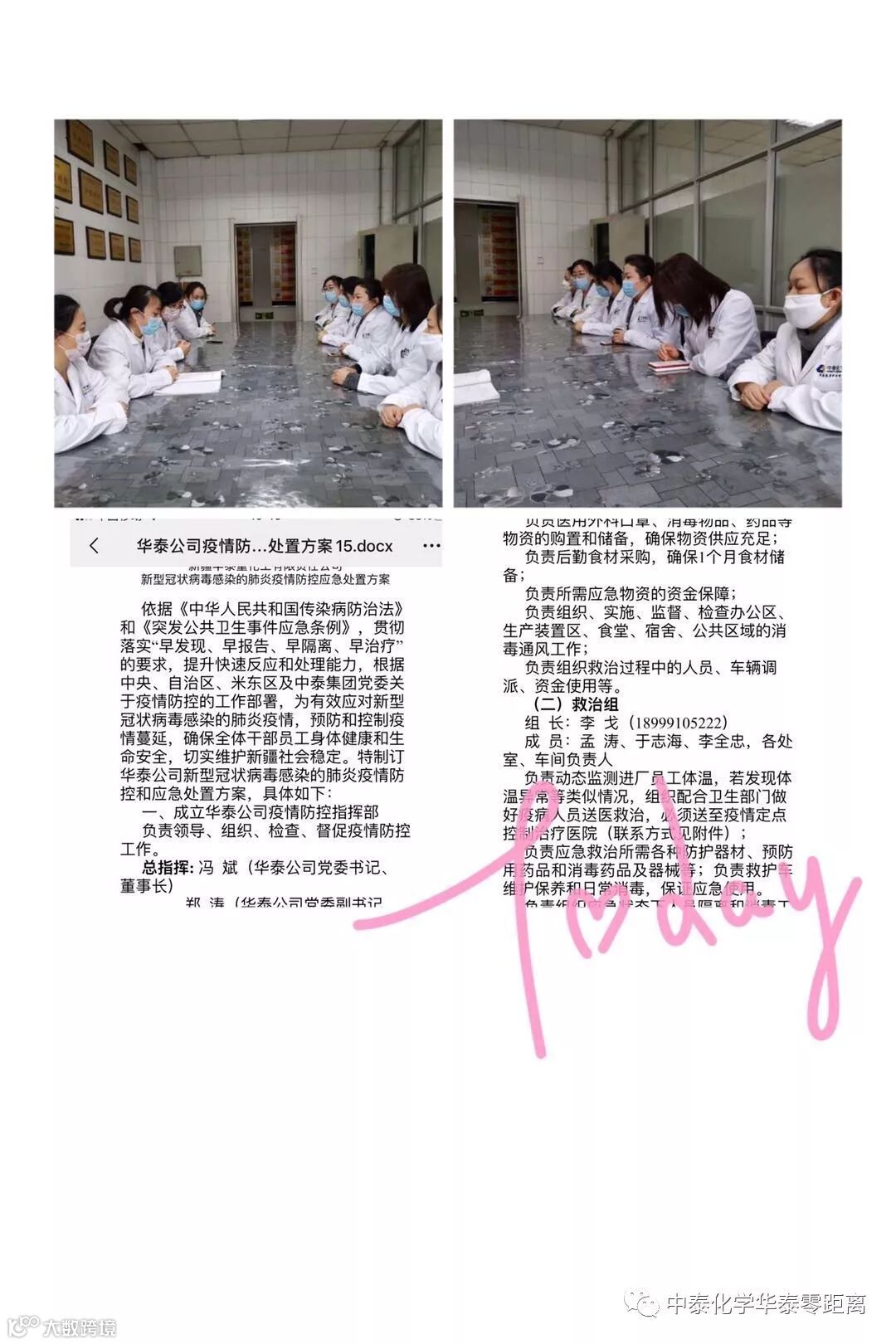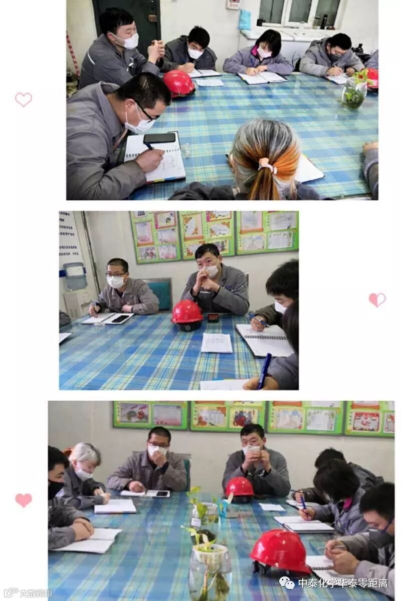 新型冠状病毒感染的肺炎疫情发生以来,全国掀起了一场抗击疫情的非常战役。国家兴亡,匹夫有责。作为新疆地方国有骨干企业的中泰集团,在抗击疫情的关键时刻,承担社会责任,履行国企担当。质量管理中心中间产品分析组利用交接班时间对对华泰公司疫情防控和处置方案进行学习,做到早发现、早报告、早隔离、早治疗”确保我们干部员工能够安全放心的上班,保障全体干部员工身体健康和生命安全,切实维护新疆社会稳定。