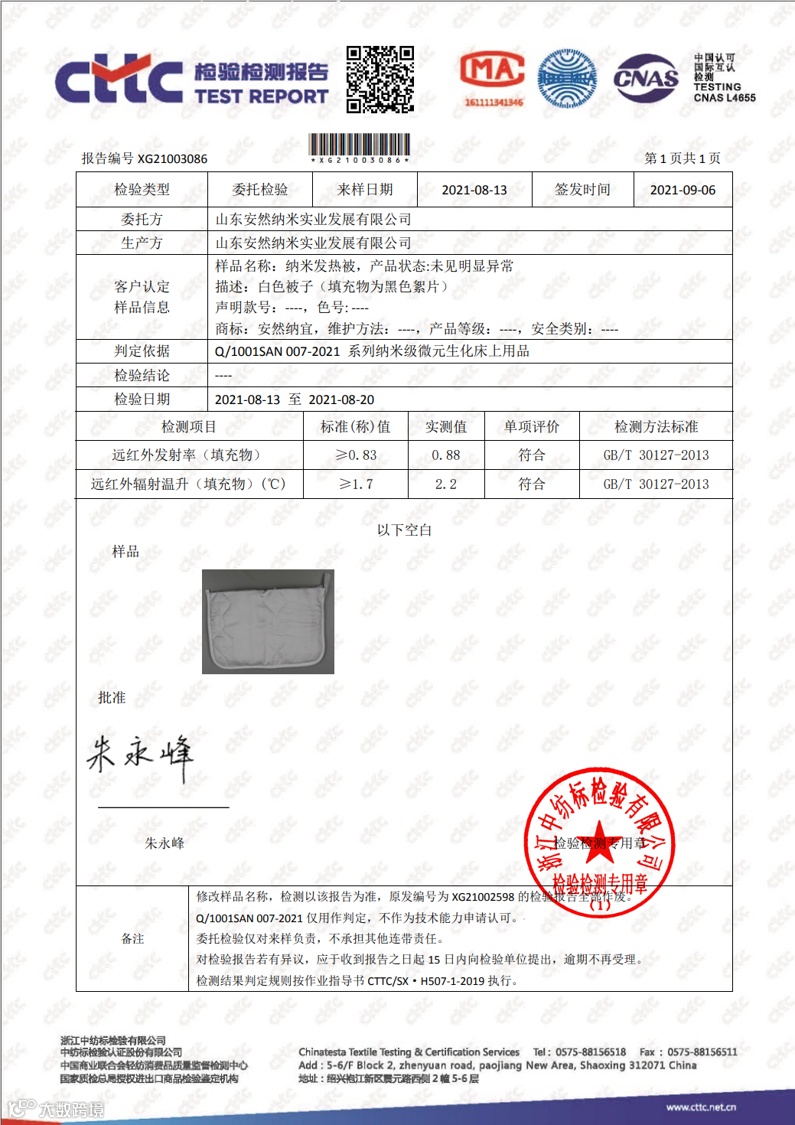 浙江中纺标检验检测报告:远红外辐射升温高于国家标准。
