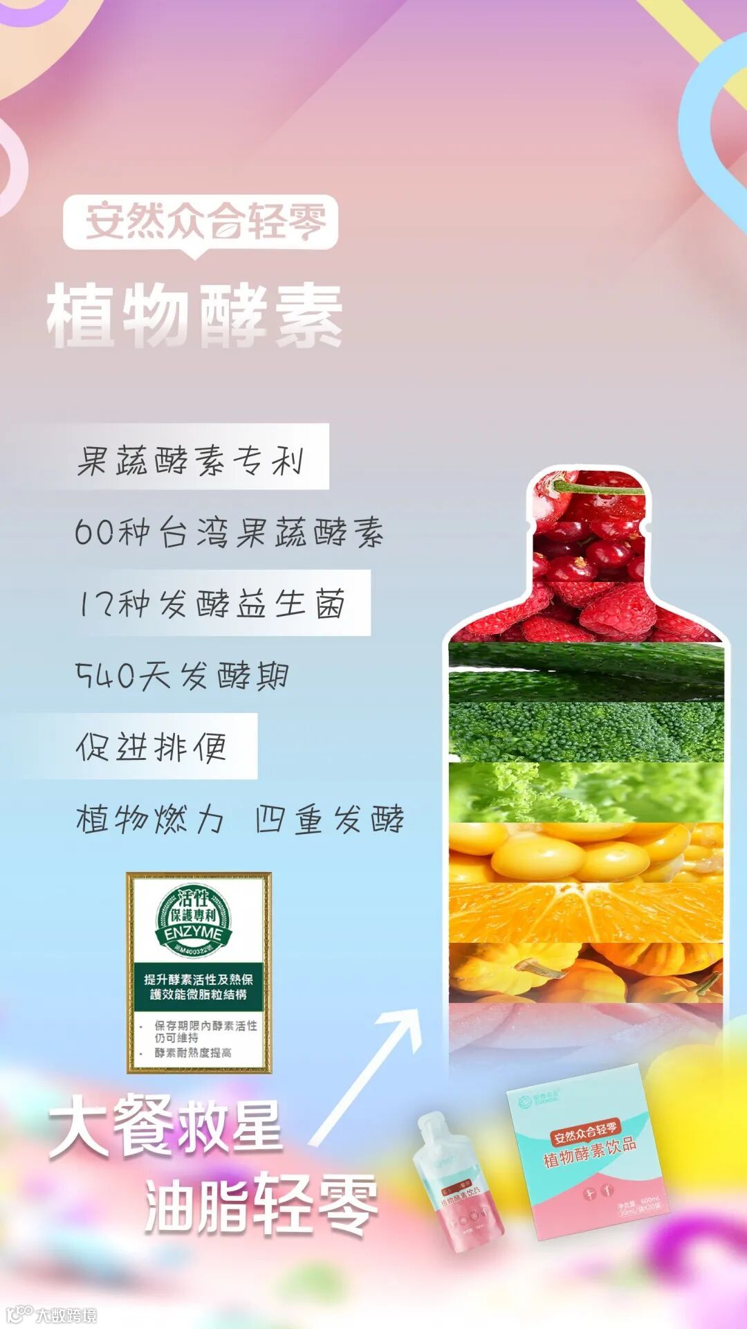 精选60种台湾优质果蔬发酵,12种发酵益生菌,经过繁复工艺,长达540天发酵期,尽情释放天然营养素。