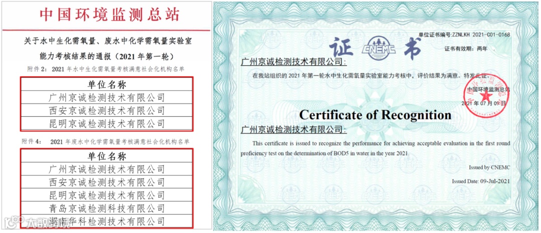近日,中国环境监测总站发布2021年第一轮“关于水中生化需氧量、废水中化学需氧量实验室能力考核结果的通报”,国检京诚集团多个实验室一次通过考核并获得“满意”结果。