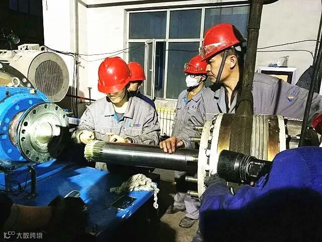 陈兵(右一)带领车间员工维修聚合离心机(孟晓荷 摄)