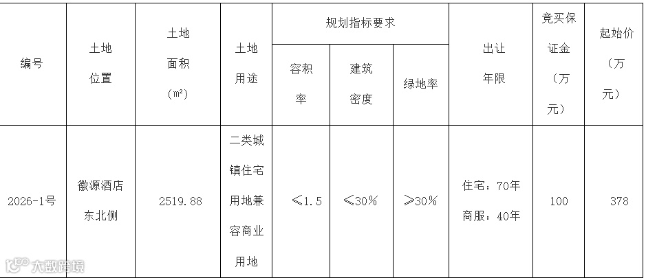 近日,旌德县土地市场迎来一宗备受关注的优质地块挂牌出让。这宗位于徽源酒店东北侧的二类城镇住宅用地兼容商业用地,以2519.88平方米的规模、378万元的起始价正式亮相,为2026年旌德县土地市场拉开序幕。