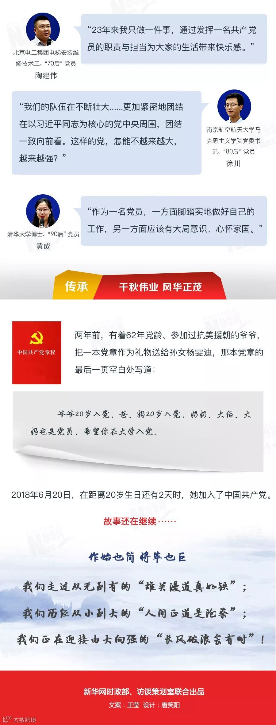 “爷爷用党章来激励我,是希望我在思想最为活跃的青春年华,用科学理论武装头脑,树立正确的世界观、人生观、价值观。”杨雯迪正在和老师同学一起深入学习习近平新时代中国特色社会主义思想,不断坚定着为中国梦贡献青春力量的信心和决心。