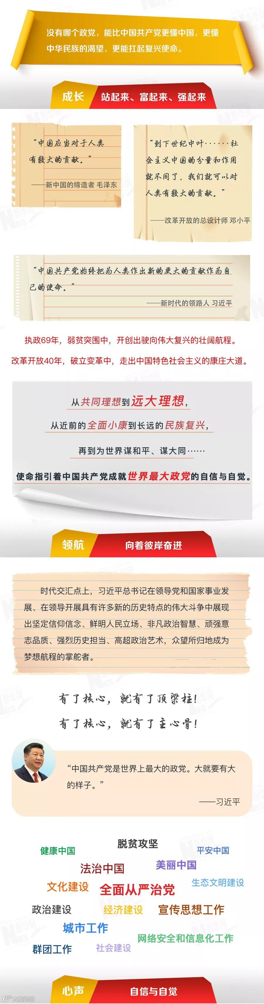 成立97年,执政69年,带领亿万人民走过40年改革开放宏伟征程,推动中国特色社会主义进入新时代,让一个曾经面临“被开除球籍”危险的国家走近世界舞台中央,让一个饱经磨难的民族接近复兴梦想……