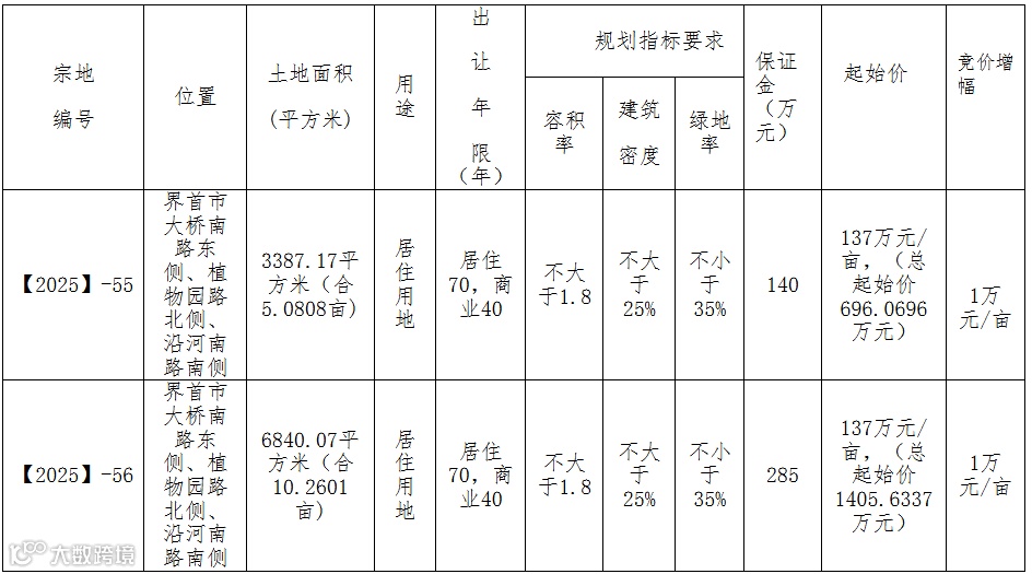 宗地建筑高度不大于60米,商业设施占比不大于计容建筑面积的7%;【2025】-55号宗地其它详细指标按规划用地函【2025】64号文件执行,【2025】-56号宗地其它详细指标按规划用地函【2025】65号文件执行。