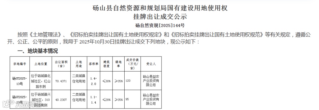 2025年11月3日,砀山县自然资源和规划局发布国有建设用地使用权挂牌出让成交公示,位于砀城镇北城社区与兴城社区的两宗优质二类城镇住宅用地顺利成交,均由砀山县益农产业投资有限公司竞得。