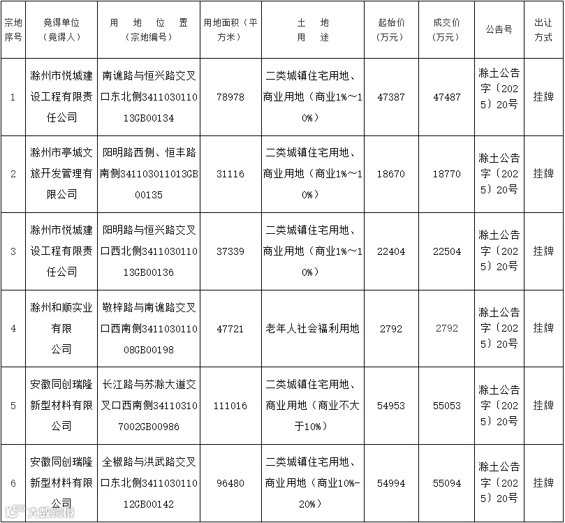 导读:2025年10月22日,滁州市自然资源和规划局在市公共资源交易中心公开挂牌出让6宗经营性用地,成交6宗。