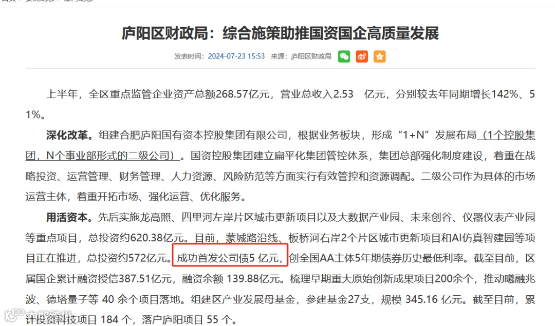 庐阳区国资系统为此提供强力支撑:2024年上半年通过发行公司债5亿元、设立产业发展母基金,重点投向城市更新领域,推动龙高照、四里河左岸等片区连片改造。