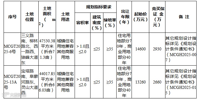 本次推出的两宗地块均位于蒙城中心城区核心拓展区域。其中,MCGT2025-6号地块坐落于三义路南、狼峰大道东侧,面积71.3亩,起始价1.46亿元;MCGT2025-13A号地块位于宝塔路南、灵山大道西,面积66.03亩,起始价1.326亿元。从规划指标看,两宗地块均采用“住宅+商服”混合用途,要求配建不低于15%的商业面积,既满足居住需求,又通过社区商业综合体填补片区商业空白。