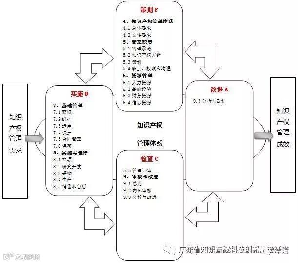 知识产权贯标,就是贯彻《企业知识产权管理规范》国家标准,国家标准以PDCA(策划、实施、检查、改进)循环管理模型为理论基础,以基于过程方法的知识产权管理模型为构建基础,明确以企业为对象,从企业知识产权管理策划出发,明确企业产品研发、扩大市场、防范风险、提高效益等知识产权需求,通过确立管理职责、配备管理资源,细化管理目标、编制管理文件,构建文件化的知识产权管理体系,并通过对实施过程的内部审核和管理评审,实现体系的持续改进,促进企业创新、改善市场和提升竞争力。