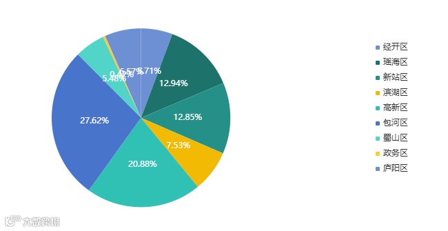 分区域来看,包河区成交面积占比27.62%,九区排名第一。高新区成交面积占比20.88%,排名第二。瑶海区成交面积占比12.94%,排名第三。