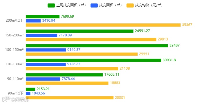 从成交面积段来看,本周成交面积段130-150m²以上的占比最大。