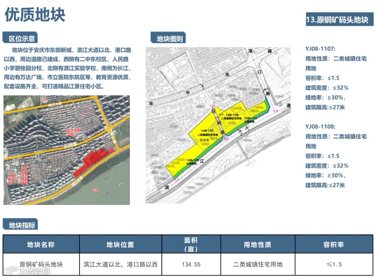 原铜矿码头地块:港口路西侧滨江头排,直面长江主航道,限高27米严控天际线,容积率≤1.5,将重塑安庆江景大平层价值体系。