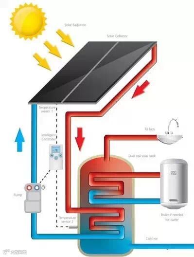 太阳能:安装再屋顶的太阳能板吸收太阳热量,传送到存储器中,以供给所需。