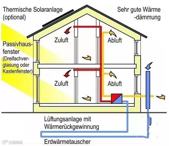 中央通风系统:使室内空气、预热过的室外空气,或浴室厨房的热空气进行交换,加上地热交换装置,采暖效率高达95%以上。