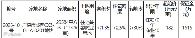1、广德市2025-10号地块(广德市城西CX3-01-A-0201地块)位于广德市祠山街道清溪社区。出让面积29584平方米(44.376亩)。