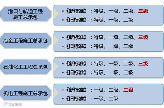 “新版标准”评价标准依然是资信状况(注册资金等)、专业技术人员(企业主要人员)、工程业绩和技术装备,序列上依然是施工总承包、专业承包和劳务;核心是在类别和等级上下大力气做了减法,同时也做了其他微调。
