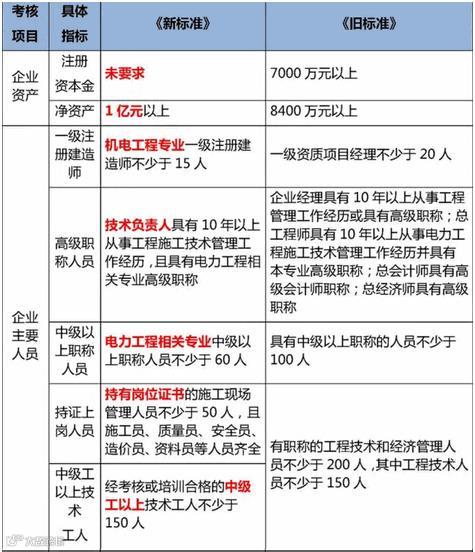 按《建筑业企业资质管理规定》,建筑业企业资质标准的四大评价维度分别是资信状况(注册资金等)、专业技术人员(企业主要人员)、工程业绩和技术装备。例如“电力工程施工总承包一级资质”考核指标新、旧标准差异一览表: