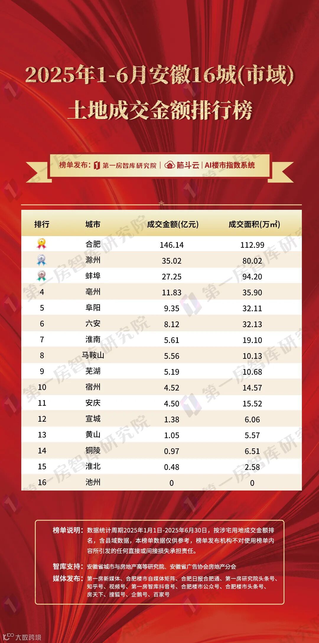 合肥土地成交146.14亿元(占全省55%),超第三名蚌埠(27.25亿)5倍,“单核效应”空前强化;