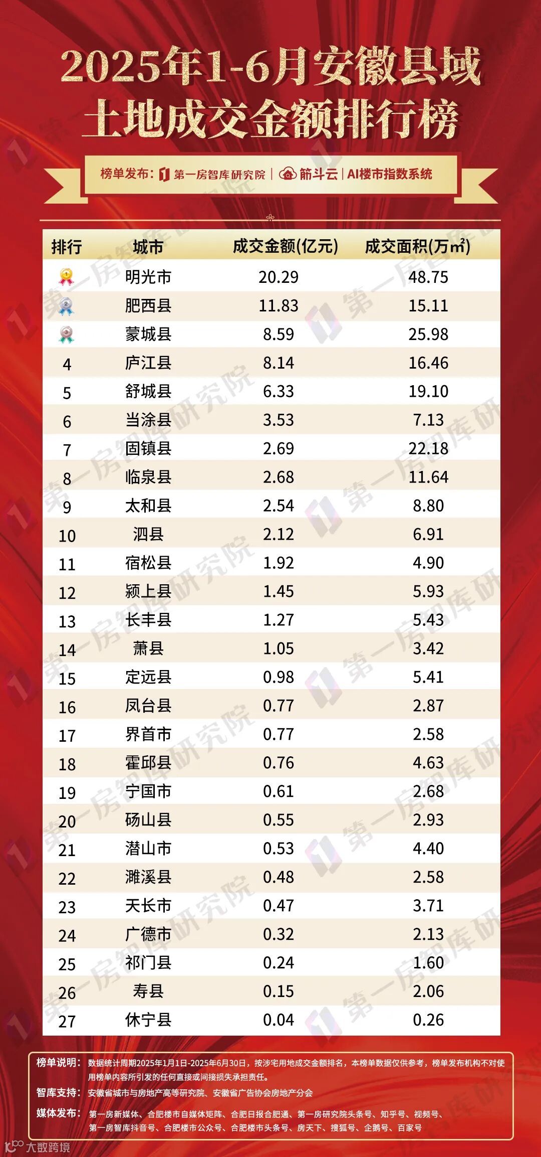 明光市以20.29亿元成交额居首,超第二名肥西县(11.83亿)71%,文旅地块成核心引擎;