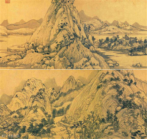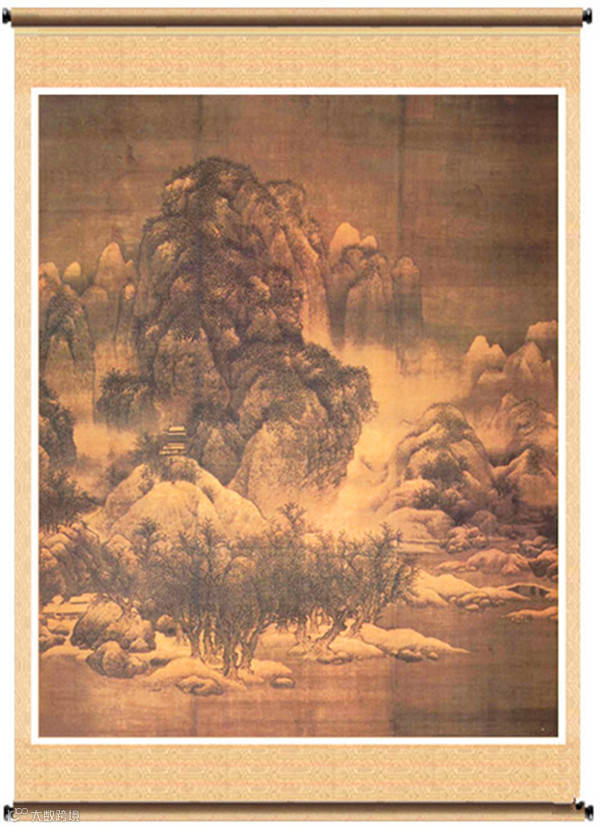 此图画群峰屏立,山势高耸,深谷寒柯间,萧寺掩映;古木结林,板桥寒泉,流水从远方迂回而下。真实而生动地表现出秦陇山川雪后的磅礴气势。笔墨浓重润泽,皱擦多与泻染,屑次分明而浑然一体,细密的雨点皱于苍劲挺拔的粗笔勾勒,表现出山石和枯木。
