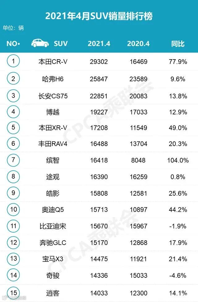 近日,乘联会发布了4月份销量统计,4月份国内狭义乘用车市场销量达160.9万辆,同比增长12.4%,环比下降8.3%;1-4月份累计销量670.2万辆,同比增长50.7%。 在SUV市场中, 东风本田CR-V以29302辆的销量排在榜首,哈弗H6以25847辆的销量屈居第二,且销量比本田CR-V差了近4000辆,长安CS75系列以20083辆排在第三。