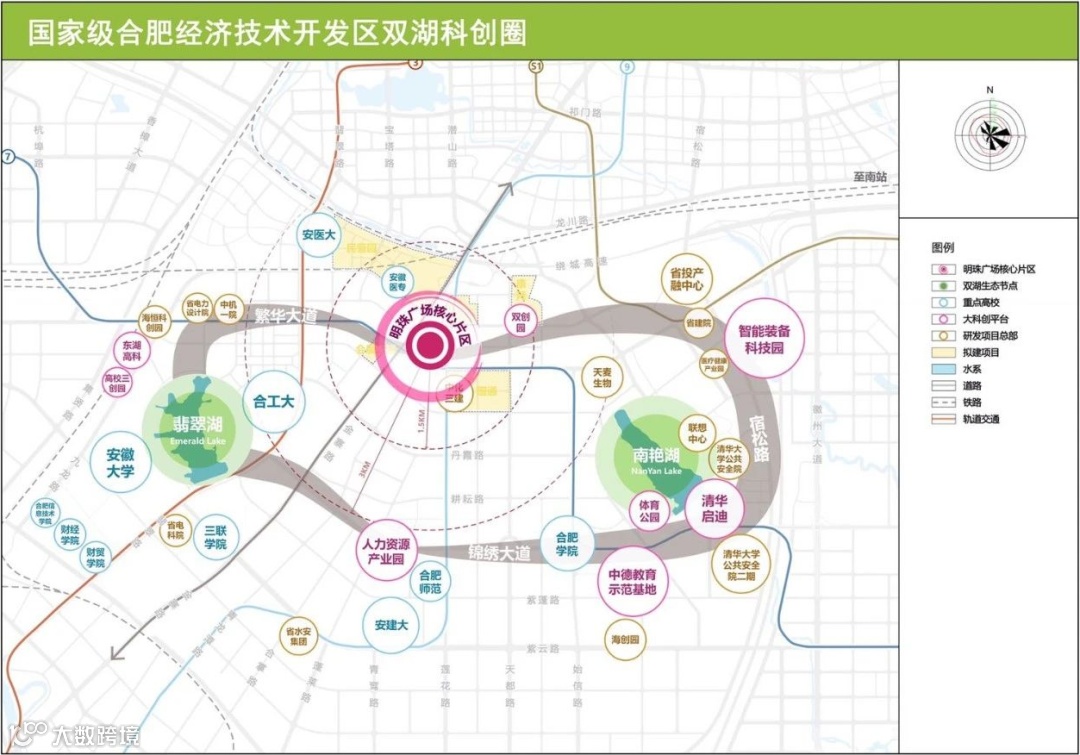 根据此前合肥十四五发布的重磅规划,明珠广场板块被赋予了高规格愿景——以“明珠广场片区”为核心,建设南部副中心,带动西南崛起;以翡翠湖、南艳湖为节点,构建“两湖科创圈”。