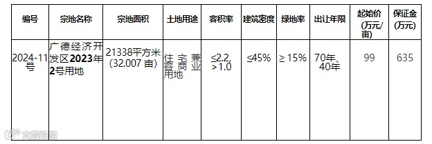 经广德市人民政府批准,广德市自然资源和规划局决定以挂牌方式出让广德市2024-11号地块国有建设用地使用权。现将有关事项公告如下: