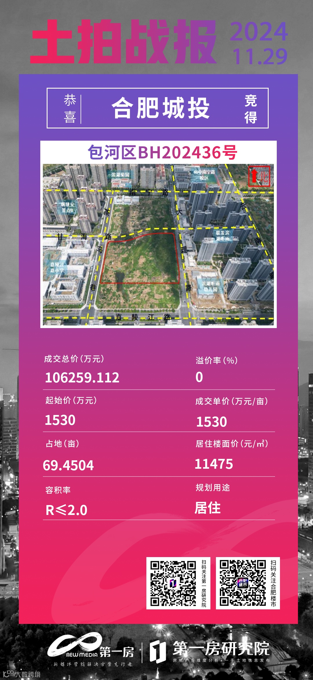 该地块被合肥城投以底价竞得,成交单价1530万元/亩,总价106259.112万元,楼面价11475元/平方米。