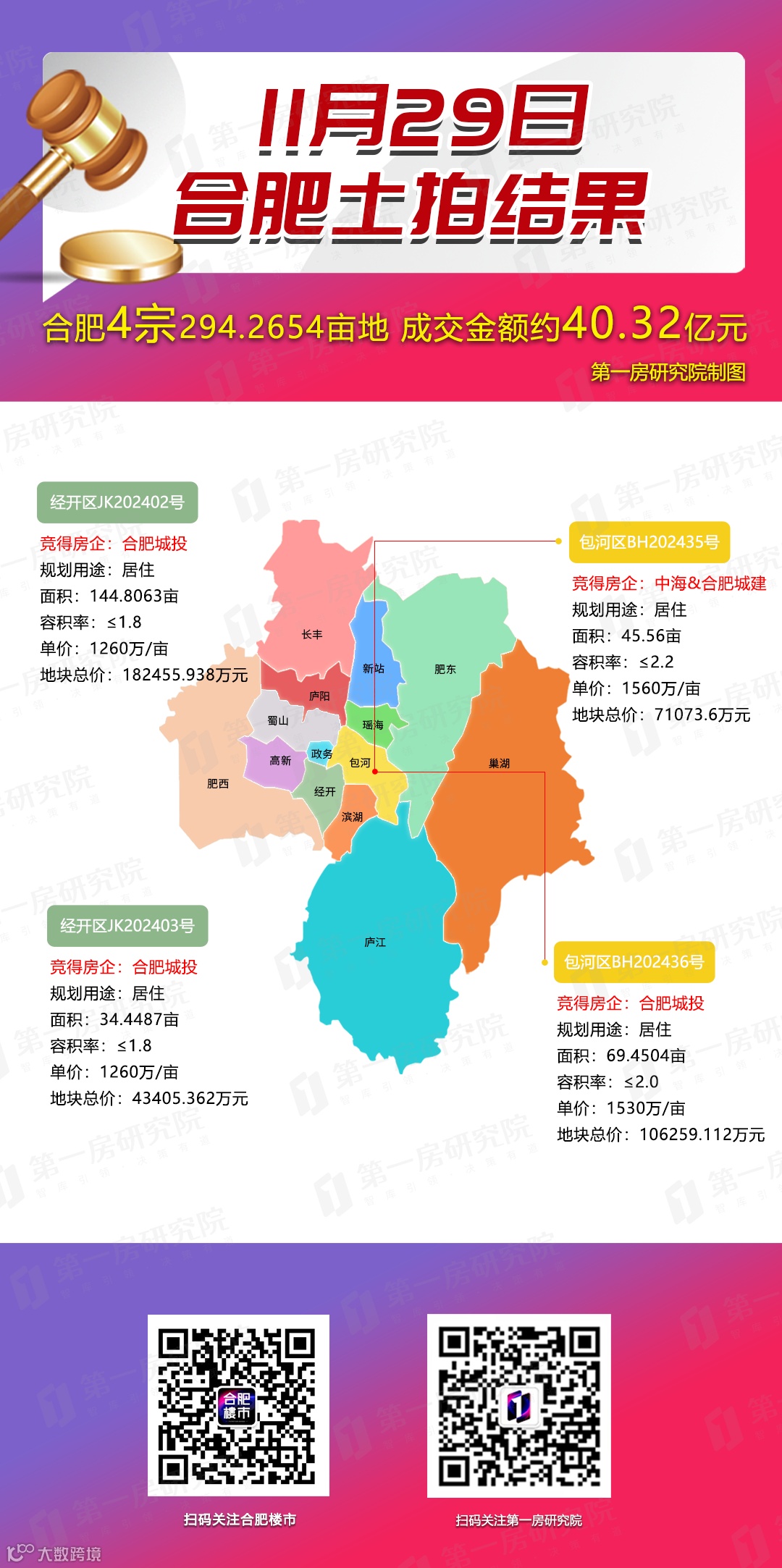 11月29日,合肥土拍落幕,4宗地块,总面积294.2654亩,最终以底价竞得,总成交金额40.32亿元。