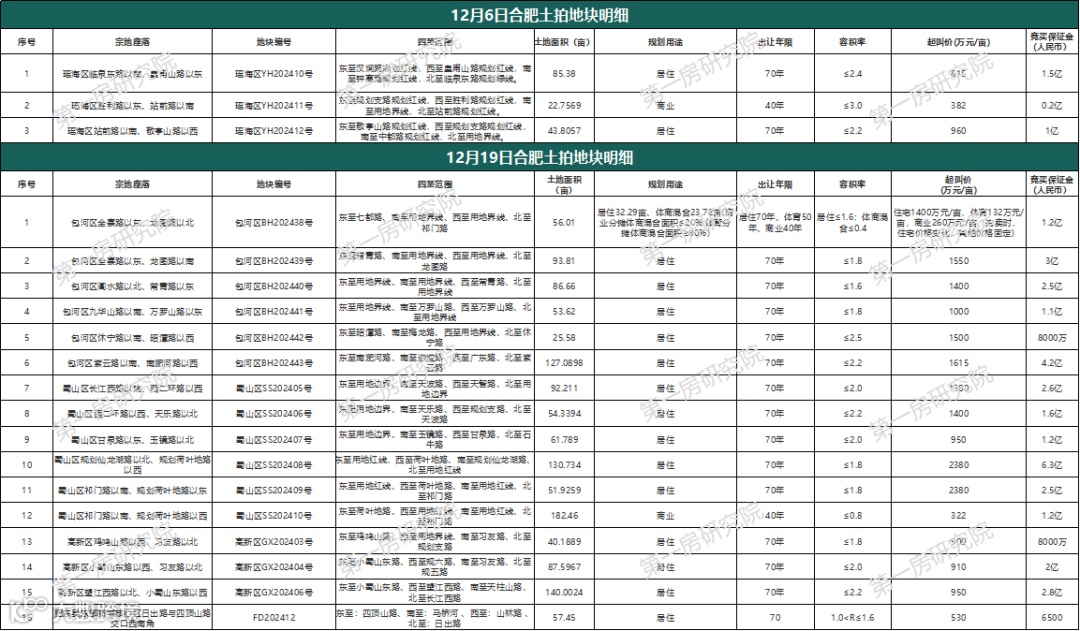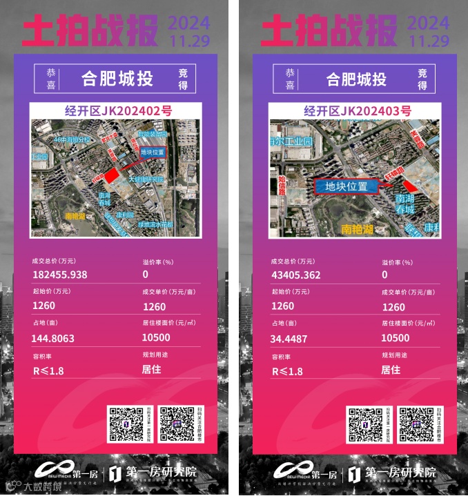这两宗地块也都由合肥城改以底价竞得,成交单价1260万元/亩,楼面价也都是10500元/㎡。