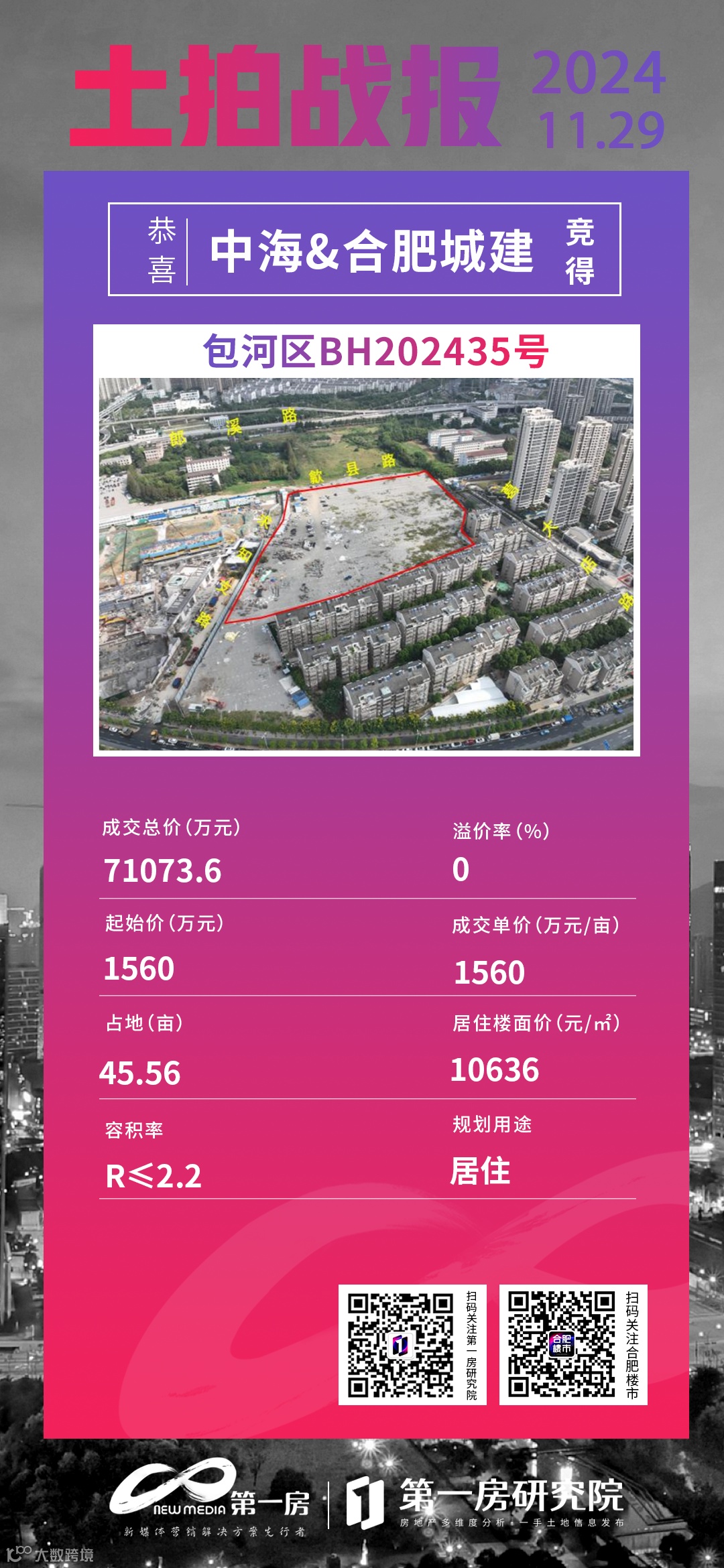 即是中海悦府东侧地块,被中海+合肥城建联合体竞得,以底价成交,单价1560万元/亩,总价106259.112万元,楼面价11475元/平方米。