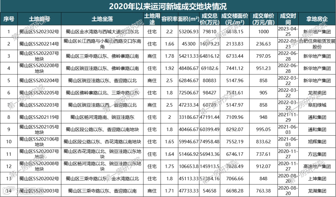 运河新城房地产市场从2020年开始,同年,龙湖和上坤成为首批进驻运河新城拓荒,此后,高速、方远、旭辉、通和、阜阳绿城、新华纷纷入驻。截止目前运河新城共成交14宗涉宅地块,其中一宗为租赁用地,新华是深耕运河新城的房企,共在运河新城拿了4宗地块,其中蜀山区SS202208地块还是竞品质项目,这也是板块内唯一一个竞品质项目。